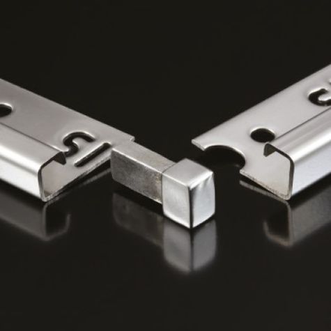 Genesis Square Edge Stainless Steel Corner pieces for use with Genesis Square Edge Stainless Steel Trim (SKU EQQ). These profiles offer superb resistance to principal chemical and atmospheric agents and are particularly recommended to protect steps in zones such as food processing industries, breweries, dairies, hospitals and external applications.