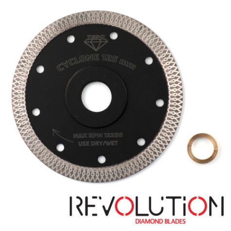 Revolution Cyclone Diamond Blades are for wet and dry cutting of tiles. The unique segment blade design provides effective removal and fine cuts. Max RPM 12220. Max cutting depth 25mm. 22.2mm bore with reducers 20 & 16mm. Blade thickness 1.5mm with 10mm segment. For straight cuts only