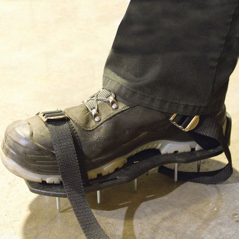 Strap these spiked overshoes on and freely walk across freshly poured floor levelling compound without ruining the finish. Adjustable straps suit any sizes of shoes or boots Hard wearing 25mm metal spikes. Tough webbing straps. Keep your boots as clean as new!